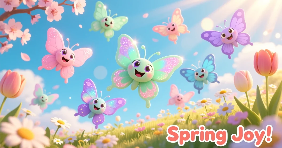 Butterfly puns illustration with smiling butterflies among blooming flowers, cheerful spring garden humor image