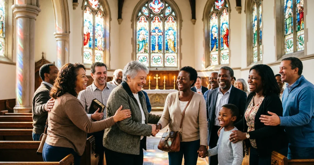 Image prompt: A warm church interior with sunlight through stained glass, smiling congregation and pastor speaking.